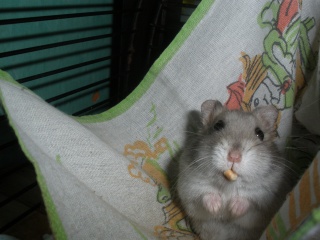 Piškotka je velmi společenská a mazlivá. Miluje kousání mříží v noci a skákání ze svého žebříčku. Sesbírává všechno jídlo co kde najde a nastřádá si jej do domečku.
